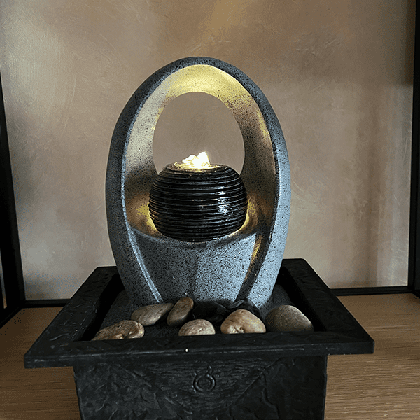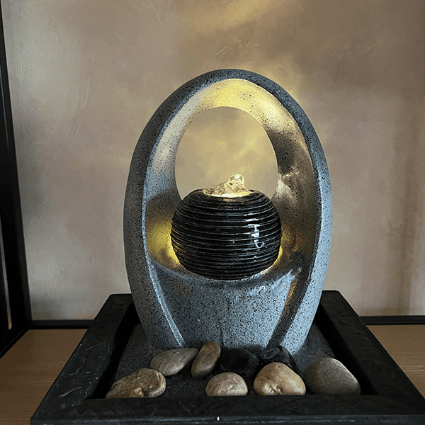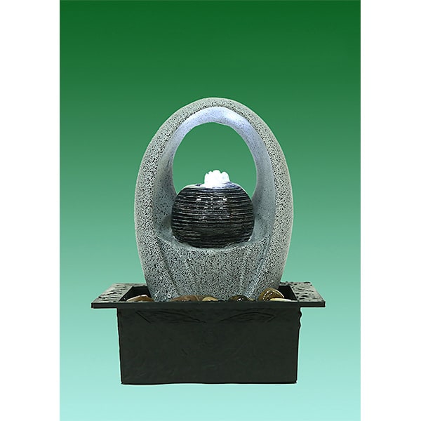 Detta fontänset i form av ett klot med en oval båge kan bli en vacker och rofylld installation inomhus. LED-ljuset ger en vacker stämning. En inomhusfontän höjer luftfuktigheten så dina blommor och krukväxter får en perfekt miljö.